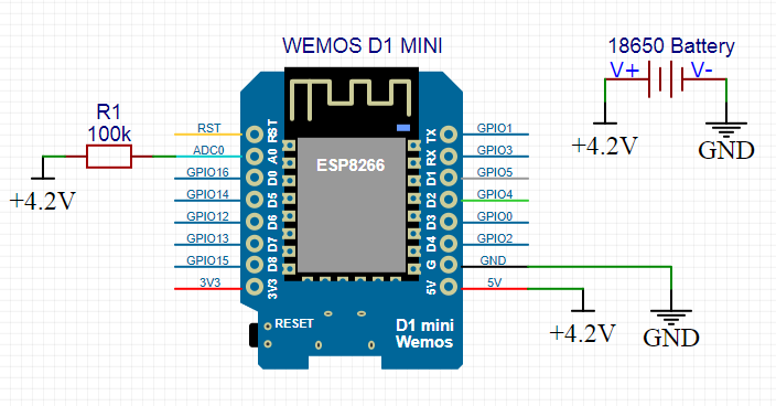 For this to work, the positive side of the (18650) battery must be connected to pin A0 of the d1 mini/esp8266 with a 100k Ohm resistor (see Useful Links).